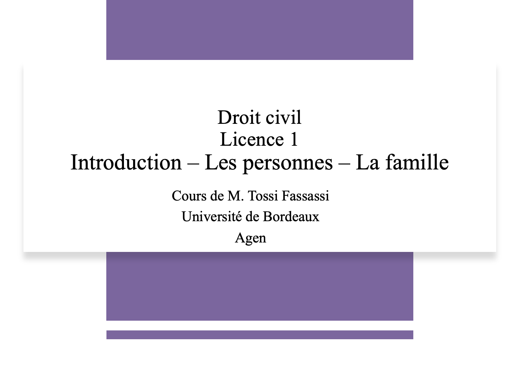 Programme L1 Droit civil : introduction au droit (semestre 1) et le droit des personnes et de la famille (semestre 2).